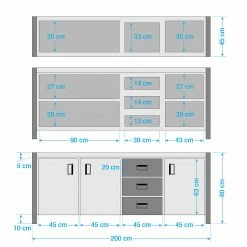 - Große Schrankfächer (BxHxT): oben: 90 x 27 x 35 cm, unten: 90 x 28 x 35 cm