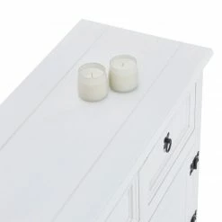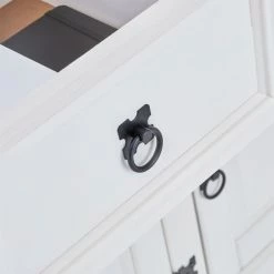 - Aus massiver Kiefer gefertigt und in weiß lasiert. Beschläge und Griffe sind aus schwarzem Metall gefertigt.