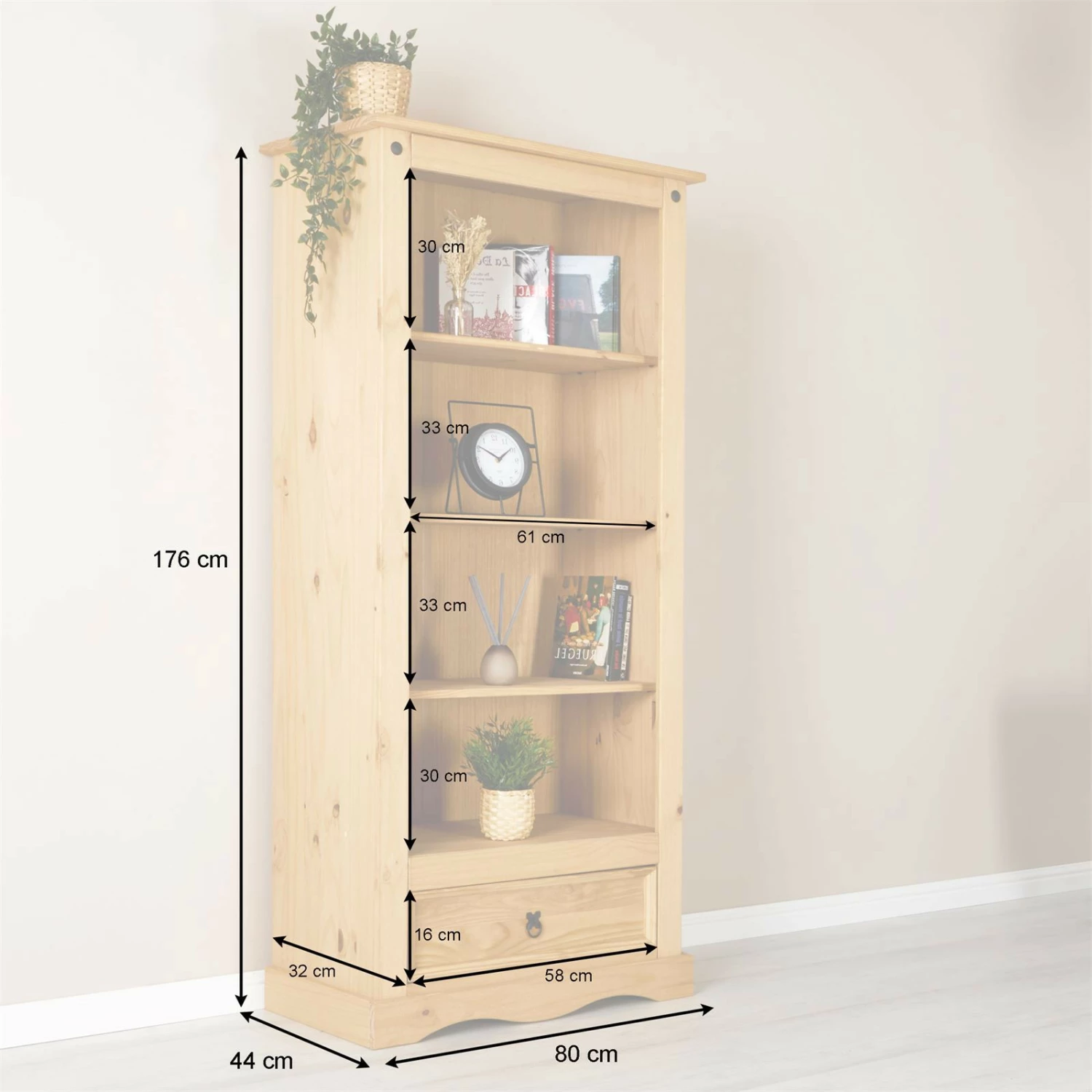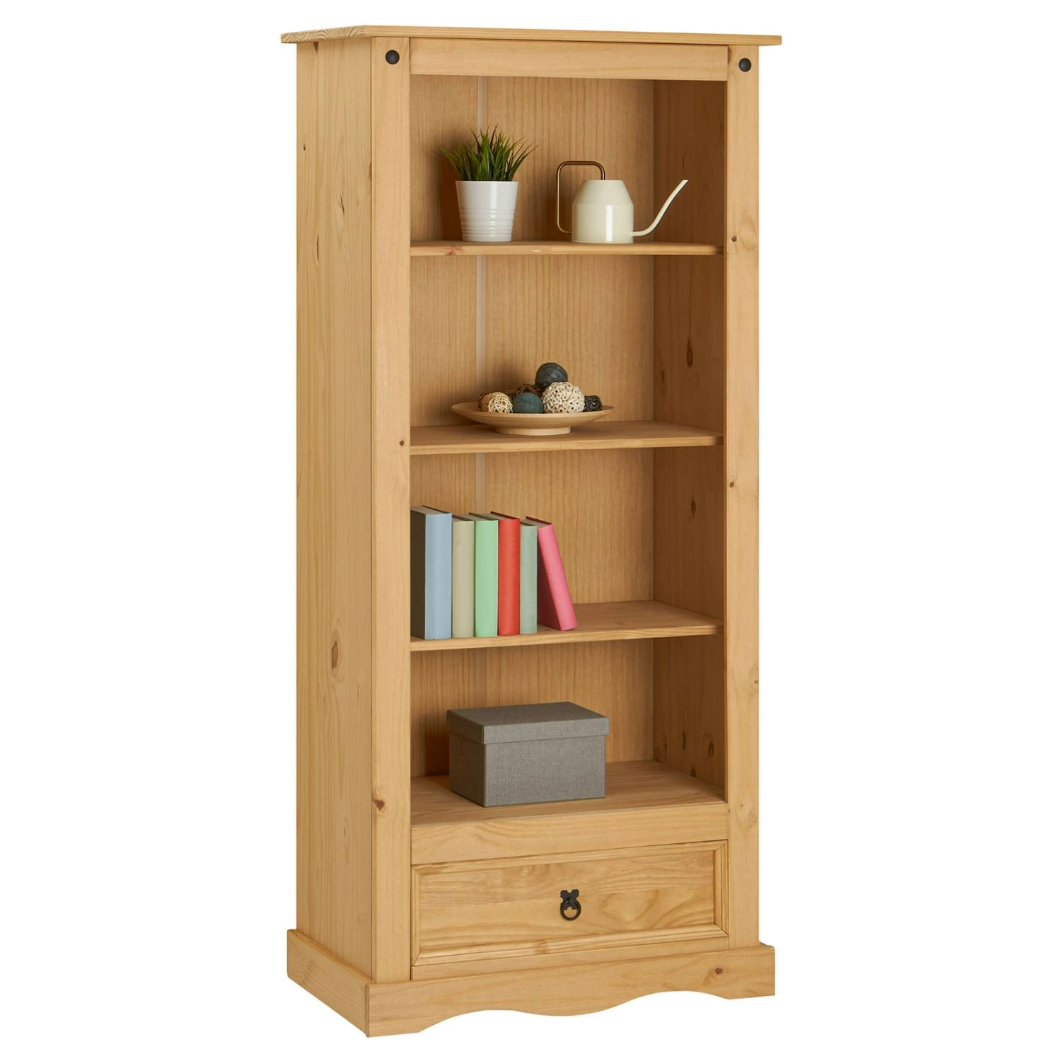 verfügt über 3 stabile Einlegeböden und somit über 4 grozßzügige und offene Fächer für Ihre Bücher oder Ihr Dekomaterial. Zudem hat unser Bücherregal einen Schubkasten für weitere Verstauungsmöglichkeiten. Der Bücherschrank passt sich perfekt, durch seine natürliche Schönheit, an Ihren Einrichtungsstil an. Schaffen Sie sich ein gemütliches Zuhause und kombinieren Sie dieses Bücherregal mit unseren weiteren Möbeln der Mexico Serie.