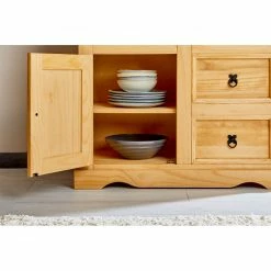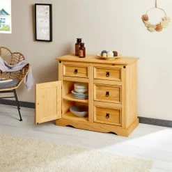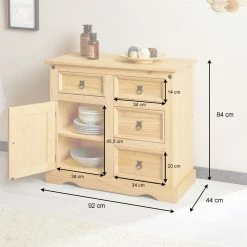 ist ein weiteres Schmuckstück aus unserer Mexiko Serie. Die Kommode im Mexico Stil ist die passende Ergänzung zu Ihren anderen Möbel und findet im Wohn- und Esszimmer oder in der Diele oder Flur immer einen Platz. Die Oberfläche des Sideboards ist gebeizt gewachst. Viel Stauraum bieten die 4 Schubladen und hinter der Tür befindet sich ein Fachboden. Die Zierbeschläge aus Metall sind schwarz lackiert.