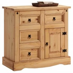 ist ein weiteres Schmuckstück aus unserer Mexiko Serie. Die Kommode im Mexico Stil ist die passende Ergänzung zu Ihren anderen Möbel und findet im Wohn- und Esszimmer oder in der Diele oder Flur immer einen Platz. Die Oberfläche des Sideboards ist gebeizt gewachst. Viel Stauraum bieten die 4 Schubladen und hinter der Tür befindet sich ein Fachboden. Die Zierbeschläge aus Metall sind schwarz lackiert.