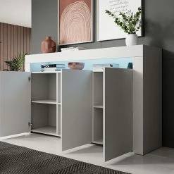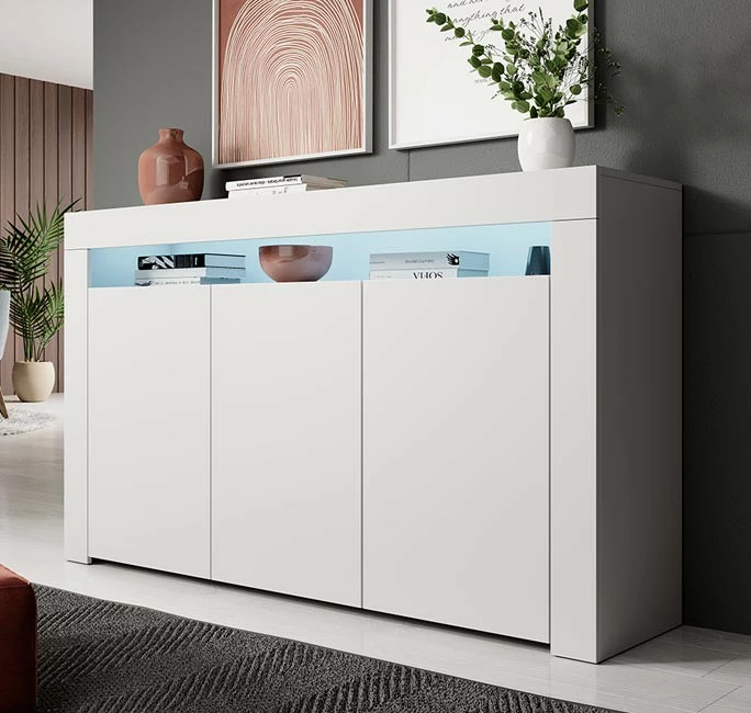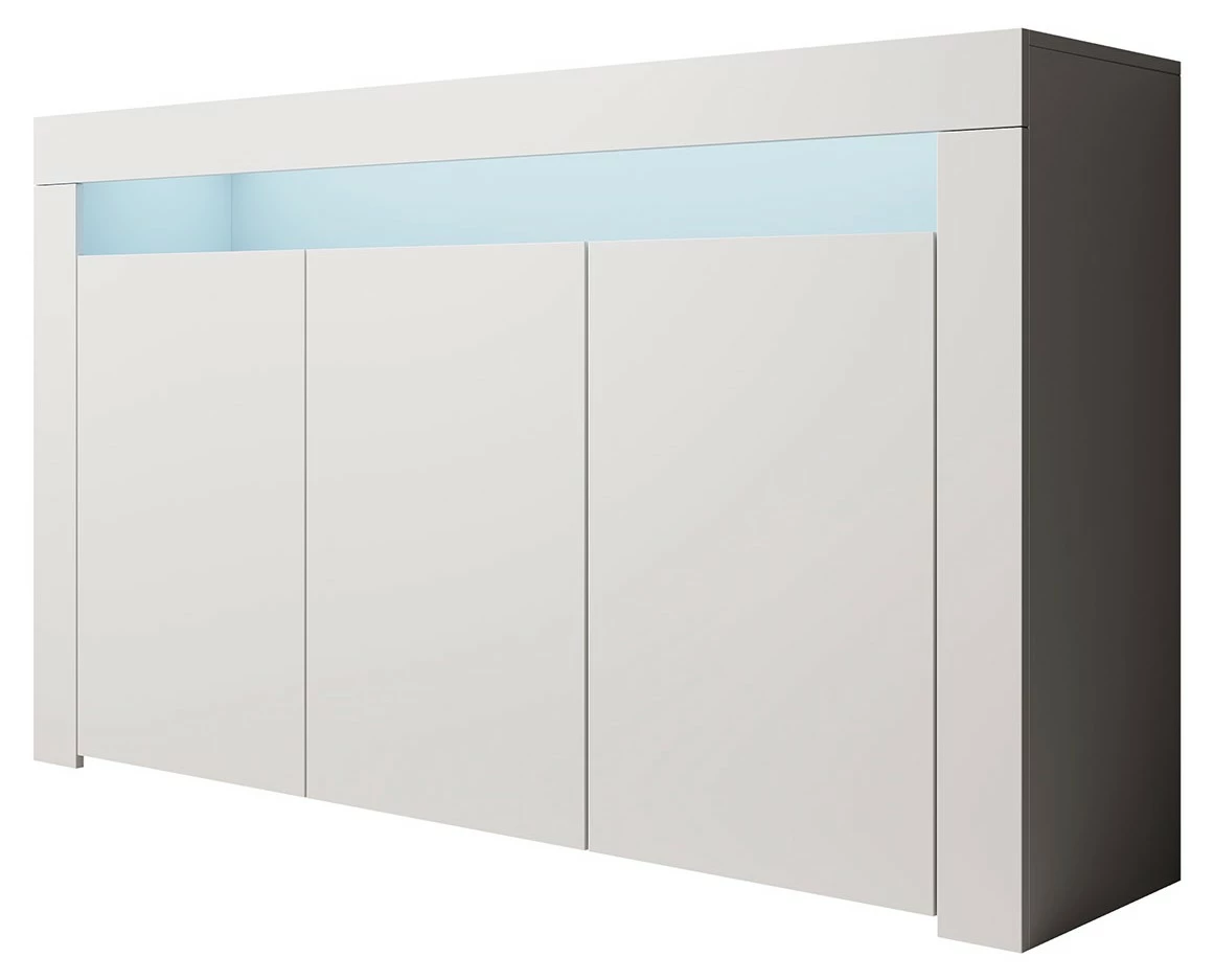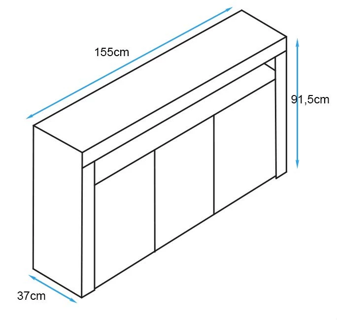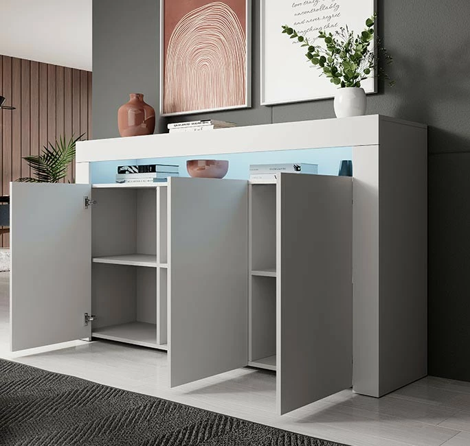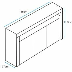 Drei Türen und einem offenen Raum mit LED-BeleuchtungGroße KapazitätHergestellt in EuropaAbmessungen:Breite: 155 cmHöhe: 91 cmTiefe: 37 cmDas Produkt wird unmontiert geliefert und enthält eine Anleitung zur einfachen Montage