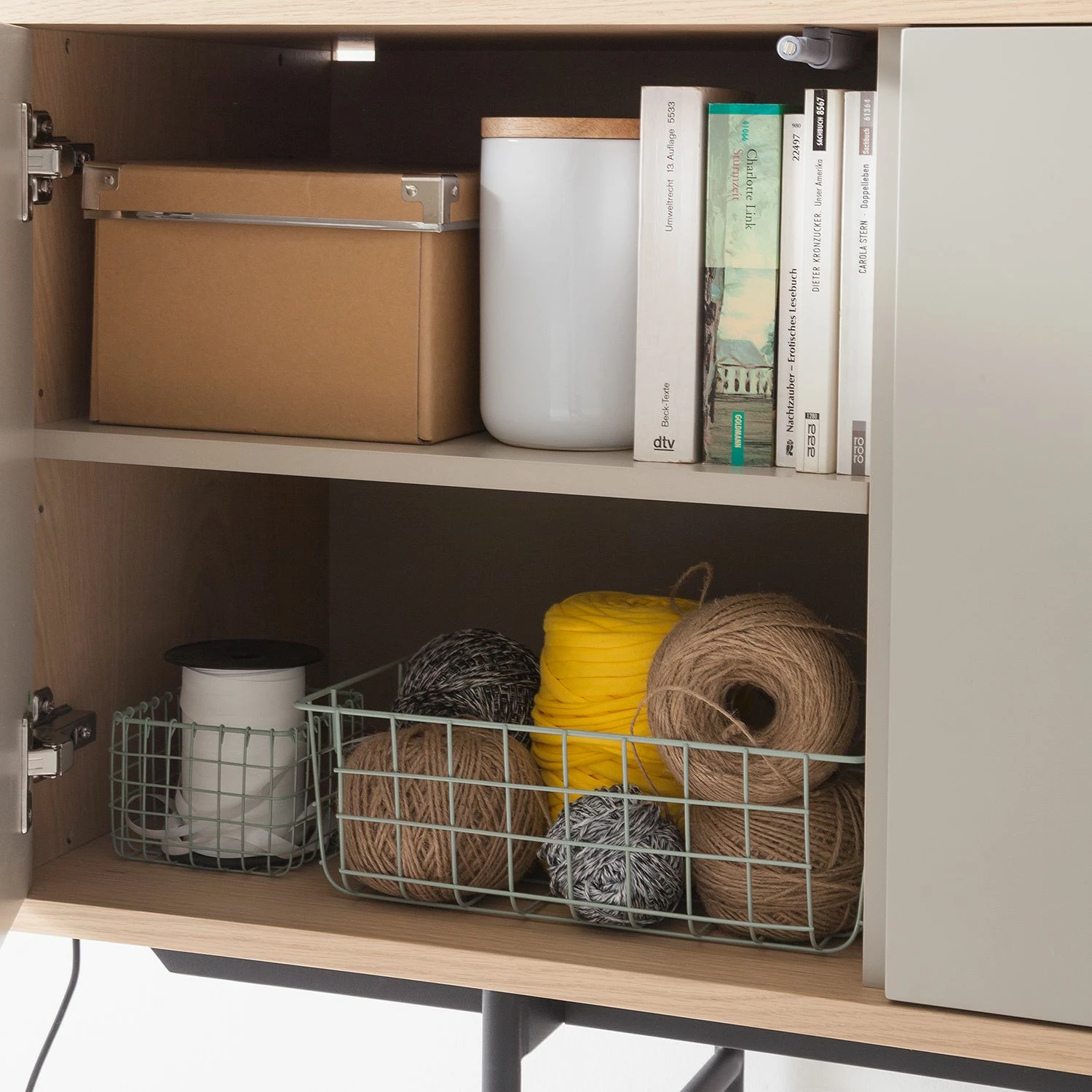 Das Sideboard Caspito sorgt mit seinem modern gezeichneten, außerordentlich originellen Stil für einen frischen Akzent im Wohn- oder Esszimmer. Besonders extravagant wirkt das in Gelb gehaltene offene Fach – ein herrlicher Farbtupfer, der dem Möbel einen sehr eigenständigen Charakter verleiht. Ein sehr schlankes Gestell aus lackiertem Eisen rundet das Gesamtbild ab. Sowohl der Korpus als auch die Fronten der Kommode bestehen aus MDF. Hinter den drei Türen des Sideboards Caspito befindet sich jeweils ein Einlegeboden.