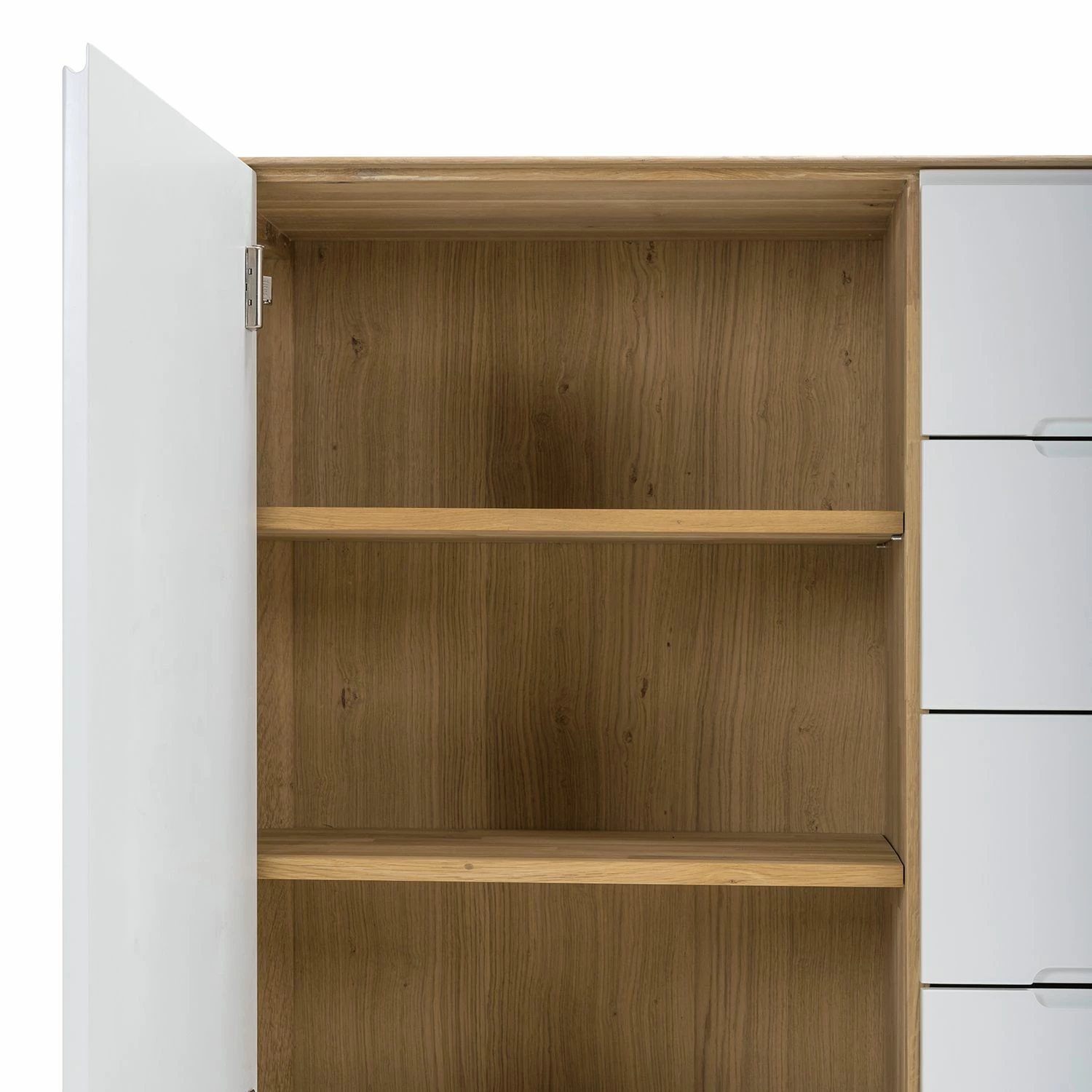 Das Sideboard Loca II besteht aus weiß lackierten MDF-Platten der Güteklasse E1 und aus geölter Wildeiche. Durch den Farbkontrast der verwendeten Materialien wird das Möbelstück zum Blickfang. Es eignet sich besonders für den skandinavischen Einrichtungsstil, der sich durch den Einsatz von Naturmaterialien und hellen Farben auszeichnet. Die Form des Sideboards Loca II erinnert mit ihren schrägen Beinen und den abgerundeten Ecken an den Einrichtungsstil der 60er Jahre, der wieder voll im Trend liegt. Mit seinen vier Schubladen und den zwei Türen mit Soft-Close Funktion kann das Sideboard Loca II nahezu geräuschlos geschlossen werden.