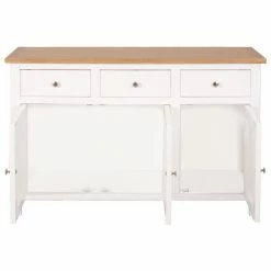 Dieses Sideboard wurde fachmännisch aus langlebigem, massiven Eichen- und Akazienholz gefertigt. Die klare Linienführung und die polierten Metallknäufe verleihen dem Möbelstück im Landhaus-Stil eine moderne Note. Die rechteckige Tischplatte eignet sich bestens als Abstellfläche für ein Telefon oder zum Präsentieren dekorativer Objekte wie Bilderrahmen oder Topfpflanzen. Die drei Schubladen und die beiden Schrankfächer mit jeweils zwei Türen bieten willkommenen Stauraum für Geschirr in Ihrer Küche oder all Ihre Unterlagen am heimischen Arbeitsplatz.